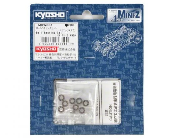 This is an optional Kyosho AWD Ball Bearing Set, and is intended for use with the Kyosho Mini-Z MA-010 and MA-015 AWD chassis. This bearing kit replaces the standard bearings with precision parts, and will help to reduce friction, improving runtime. Â
