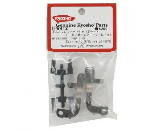 This is an optional Kyosho Aluminum Front Hub Set, and is intended for use with the Inferno MP9. These upgrade parts are direct replacements for the stock plastic front hub carrier. CNC Machined from 7075 aluminum and Hard Anodized in Kyosho’s unique gunmetal finish, these hubs add not only a cool factory look, but also strength, rigidity and reliability to the MP9 and MP9e platforms. Includes the caster inserts that allow for -1°, 0° and +1° caster adjustments.