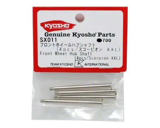 This is a pack of four replacement Kyosho Front Wheel Hub Shafts, and are intended for use with the Kyosho Scorpion XXL VE 1/7 scale buggy. These shafts are used as outer arm hinge pins on the front and rear of the vehicle.Â