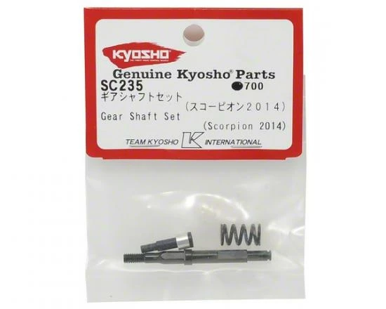 This is a replacement Kyosho Scorpion 2014 Gear Shaft Set. Package includes the main shaft, counter gear shaft, spacer and slipper spring.