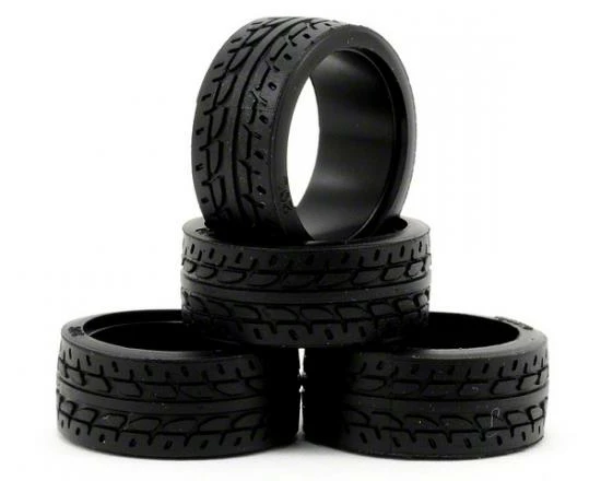 This is a set of four Kyosho 8.5mm Racing Radial Tires. These radial tires are used with the Mini-Z Racer series kits, and feature a special patterned edge that is effective on both urethane and carpet surfaces. Specific left and right sides feature a directional pattern and the durometer hardness rating is etched on the inside of the tire.