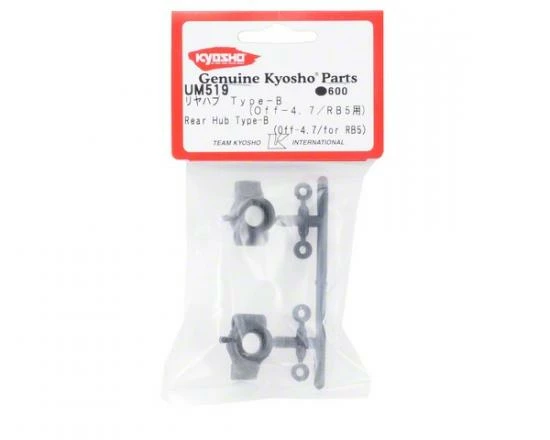 This is a replacement Kyosho “Type B” Rear Hub Set. These hubs come standard with the Ultima RB6, RB5 SP, RT5, SC, SCR, DB, and Lazer FS vehicles. These hubs can be used optional with the RB5 SP2 and Lazer FS2 vehicles to provide optional camber holes. Package also includes four plastic spacers.