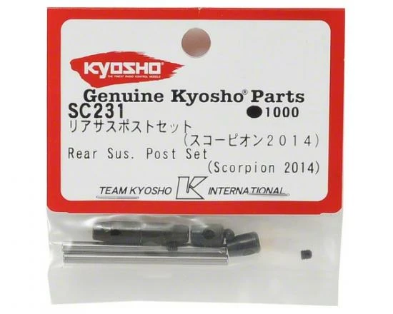 This is a replacement Kyosho Scorpion 2014 Rear Suspension Post Set. Package includes rear arm mounting posts, hinge pins and set screws.