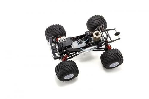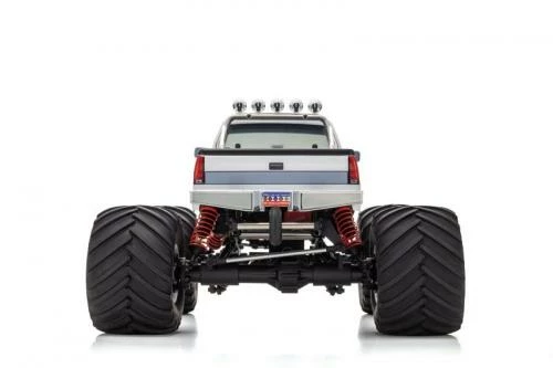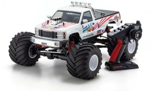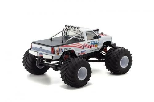 Built on a pickup truck chassis, large diameter tires and big engines with massive horsepower were installed by fun-loving American off-roaders to create the monster truck. These ever-popular monster trucks can be seen on specially-made racing circuits or jumping rows of cars in stadiums across the USA. Many R/C monster truck models have been produced over the years. First among equals is the legendary 1/8 scale USA-1 that embodied the might of American trucking power during the 1980’s and 90’s. Officially licensed by Kyosho in the 1990’s, the R/C model uniquely captured the power and glory of the USA-1. Now it’s ‘comeback-time’ for the USA-1, with modern chassis and drivetrain technology, upgrades unique to the USA-1 throughout, and a newly-designed ‘ULTRA SCALE BODY’ with form and detail finished to display-model standards. The iconic American flag graphic emblazoned on the body makes your heart swell with pride! The chassis features shaft-driven 4WD and 5-link suspension based on the Mad Crusher 2.0 & FO-XX models. Most of the suspension components have been uniquely upgraded and reinforced for the USA-1 at each point to handle the powerful new KE25SP2 engine, and the rigors of monster trucking. A 3-speed automatic transmission produces dynamic acceleration, which is enhanced by a true suspension system to produce “scale” running characteristics worthy of the prestigious USA-1, and make you feel like a monster truck driving god. Released as a pre-assembled Readyset, the USA-1 is almost ready for action straight out of the box.